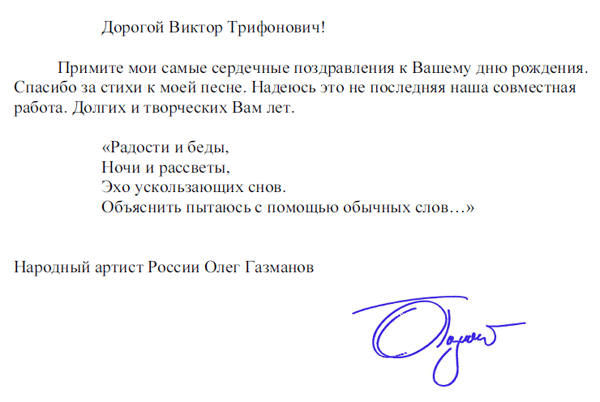 Дорогой и многоуважаемый Виктор Трифонович! Искренне желаю Вам отличного здоровья, творческих озарений, всевозможных успехов, семейного благополучия!