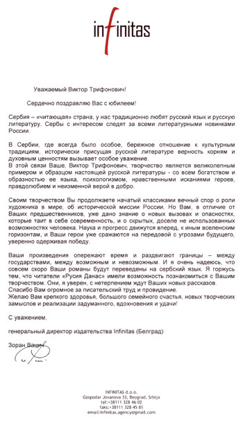 Ваши произведения опережают время и раздвигают границы – между государствами, между возможным и невозможным. И я очень надеюсь, что совсем скоро Ваши романы будут переведены на сербский язык. Я горжусь тем, что читатели «Русия Данас» имели возможность познакомиться с Вашим творчеством. Они, я уверен, с нетерпением ждут Ваших новых рассказов.