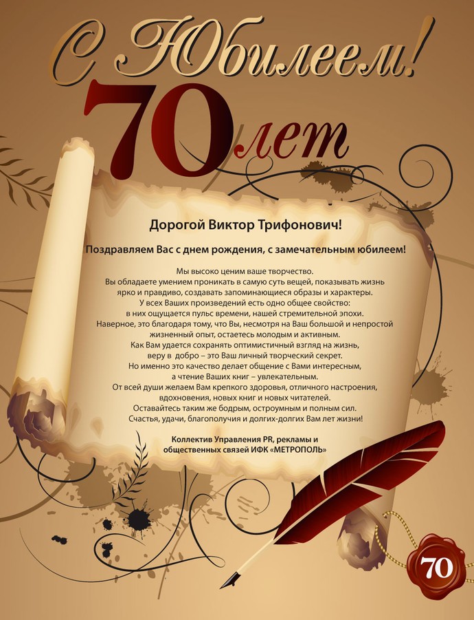 В этой связи Ваше, Виктор Трифонович, творчество является великолепным примером и образцом настоящей русской литературы - со всем богатством и образностью ее языка, психологизмом, нравственными исканиями героев, правдолюбием и неизменной верой в добро.