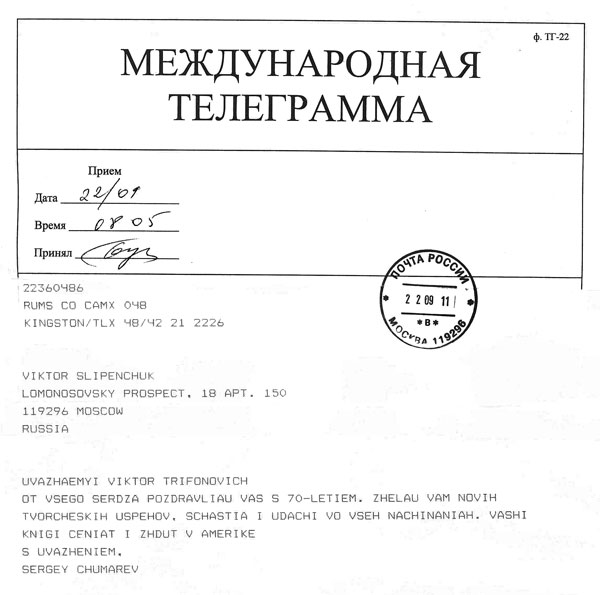 Большое спасибо за сердечные поздравления с моим юбилеем – 70-летием! В такой день дорого любое дружеское внимание, а особенно дорого оно от коллеги, собрата по перу, каким являетесь Вы – видный общественный и государственный деятель.