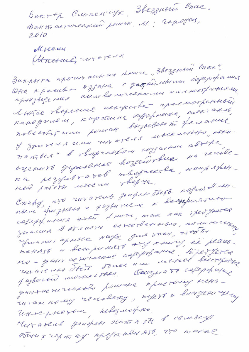 Закрыта прочитанная книга «Звездный Спас» Виктора Слипенчука. (Фантастический роман. М.: «Городец», 2010). Она красиво издана с достойными содержания произведения символическими иллюстрациями. Любое творение искусства – просмотренный кинофильм, картина художника, спектакль, повесть или роман вызывают желание у зрителя или читателя мыссленно «покопаться» в творческом сознании автора, оценить духовное воздействие на человека результатов творчества, напряженной работы мысли творца.