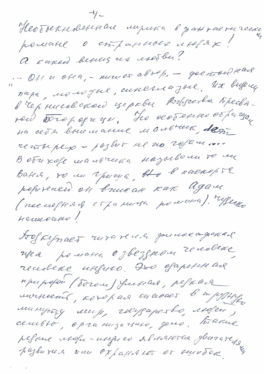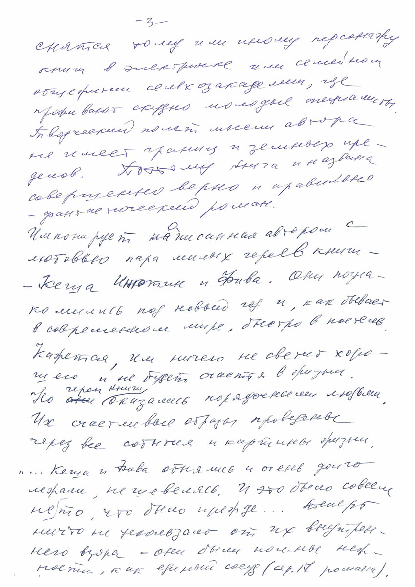 Импонирует описанная автором с любовью пара милых героев книги – Кеша Инютин и Фива. Они познакомились под новый год и , как бывает в современном мире, быстро в постель. Кажется, им ничего не светит хорошего и не будет счастья в жизни. Но герои книги оказались порядочными людьми. Их счастливые образы проведены через все события и картины жизни. «… Кеша и Фива обнялись и очень долго лежали не шевелясь. И это было совсем не то, что было прежде…. Теперь ничто не ускользало от их внутреннего взора – они были полны нежности, как единый сосуд (стр.17 романа). Необыкновенная лирика в фантастическом романе о странных людях! А какой венец их любви? «… Он и она,- пишет автор, достойная пара, молодые, синеглазые. Их видели в Черниговской церкви Рождества Пресвятой Богородицы. Но особенно обращал на себя внимание мальчик, лет четырех, развит не по годам…. В обиходе мальчика называли то ли Ваня, то ли Гриша, но в паспорте родителей он вписан как Адам ( последняя страница романа). Чудесно написано!