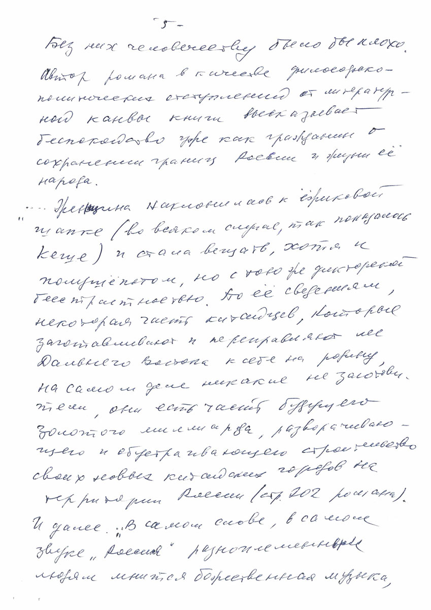 «… Женщина наклонилась к ежиковой шапке (во всяком случае так показалось Кеше) и стала вещать, хотя и полушепотом, но с тою же дикторской бесспристрастностью. По ее сведениям, некоторая часть жизни китайцев, которые заготавливают и переправляют лес дальнего Востока к себе на родину, на самом деле никакие не заготовители, они есть часть будущего и обустраивающего строительство своих новых китайских городов на территории России (стр. 202 романа) И далее «… В самом слове, в самом звуке «Россия» разноплеменным людям мнится божественная музыка, воспевающая жизнь человеческую…»