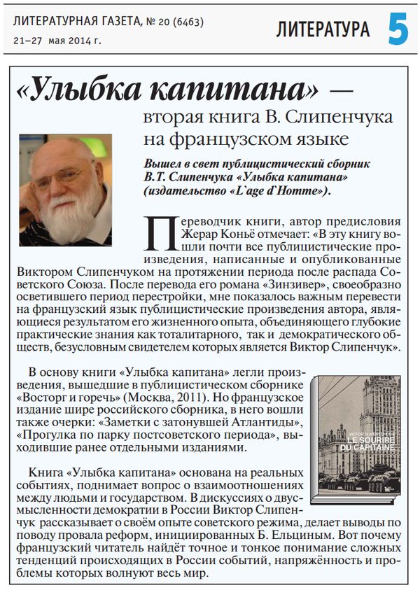 «Литературная газета», №20 (6463), анонс о книге В.Т. Слипенчука «Улыбка капитана» — издательство «L`age d`Homme», 21 мая 2014 года