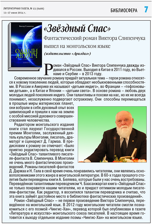 «Литературная газета», №23 (6466), статья о выходе романа В.Т. Слипенчука «Звёздный Спас» на монгольском языке 11.06.2014