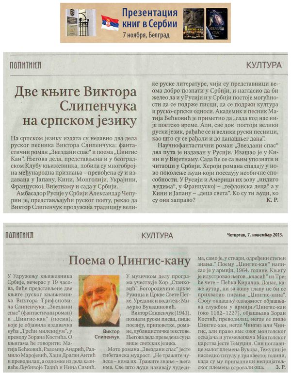 Ежедневная газета «Политика» (Сербия), №35921, №35938, заметки о презентации двух книг В.Т. Слипенчука, 7 ноября 2013 года, 25 ноября 2013 года