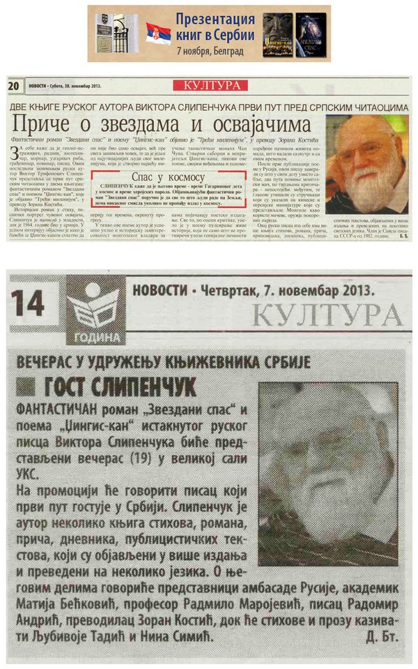 Ежедневная газета «Вечерние новости» (Сербия), сообщения о презентации двух книг В.Т. Слипенчука, 7 ноября 2013 года, 30 ноября 2013 года