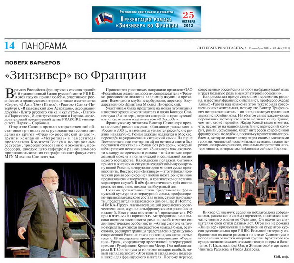 «Литературная газета», № 44 (6391), репортаж о презентации романа «Зинзивер» в Париже, 7 ноября 2012 года