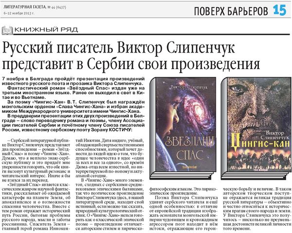 «Литературная газета», №44 (6437), анонс предстоящей презентации книг В.Т. Слипенчука «Звёздный Спас» и «Чингис-Хан» в Сербии, 6 ноября 2013 года