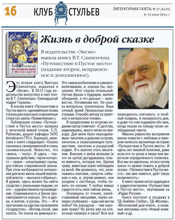 «Литературная газета», №27 (6470), статья о выходе книги В.Т. Слипенчука «Путешествие в Пустое место» — издательство «Эксмо» 9.07.2014