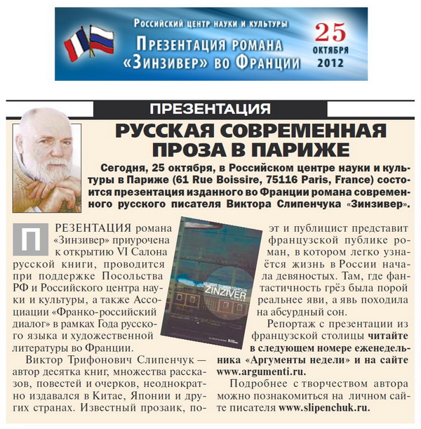АРГУМЕНТЫ НЕДЕЛI, № 41 (333), заметка о предстоящей презентации романа «Зинзивер» во Франции, 25 октября 2012 года