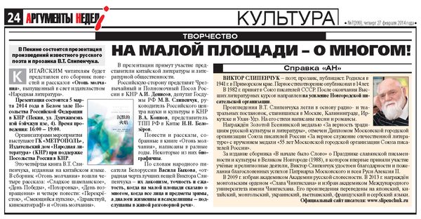 АРГУМЕНТЫ НЕДЕЛI, №7 (399), анонс предстоящей презентации книги В.Т. Слипенчука «Огонь молчания» в Китае, 27 февраля 2014 года