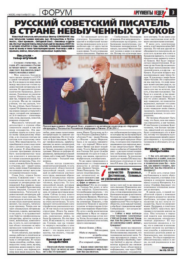 АРГУМЕНТЫ НЕДЕЛI, №39 (280), интервью Виктора Слипенчука «Русский советский писатель в стране невыученных уроков», 06 октября 2011 года