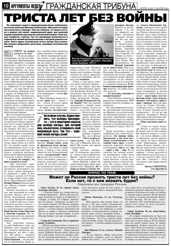 Газета «Аргументы недели» №25(59), очерк "Триста лет без войны", июнь 2007 г.
