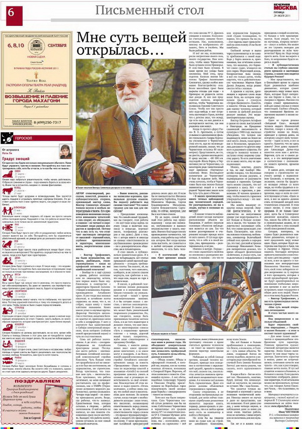 «ВЕЧЕРНЯЯ МОСКВА», №139 (25654), интервью Виктора Слипенчука «Мне суть вещей открылась…», 29 июля 2011 года
