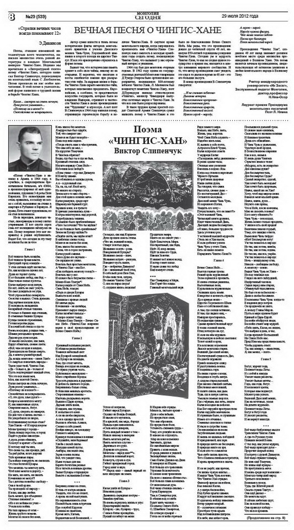 Газета «Монголия сегодня» (г. Улан-Батор, русскоязычное издание), №29 (539), поэма «ЧИНГИС-ХАН», 29 июля 2012 года