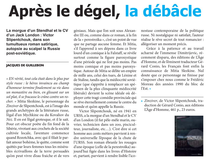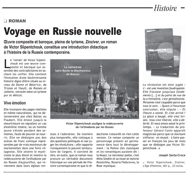 «l’Action francaise» (№2851, 15 ноября – 5 декабря 2012г.), рецензия на издание романа «Зинзивер», 19 ноября 2012 года