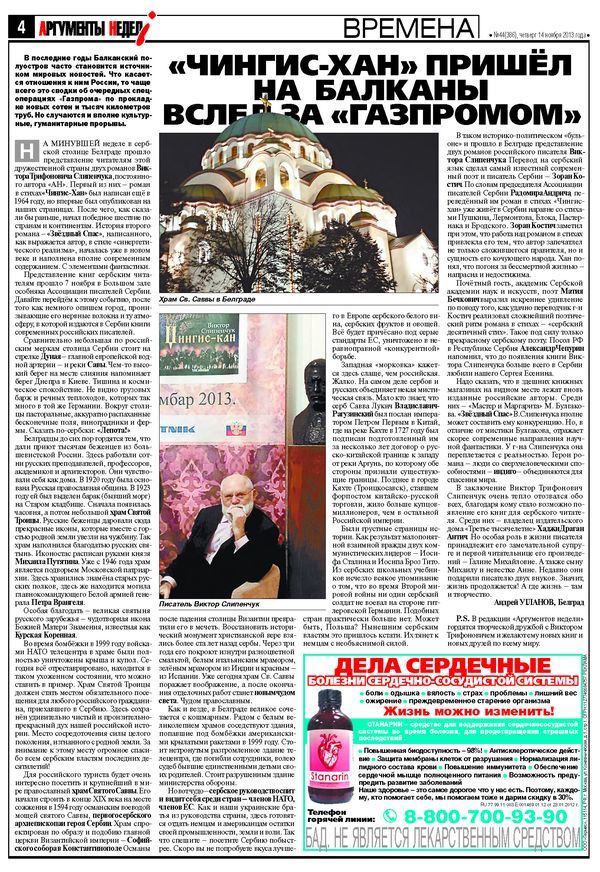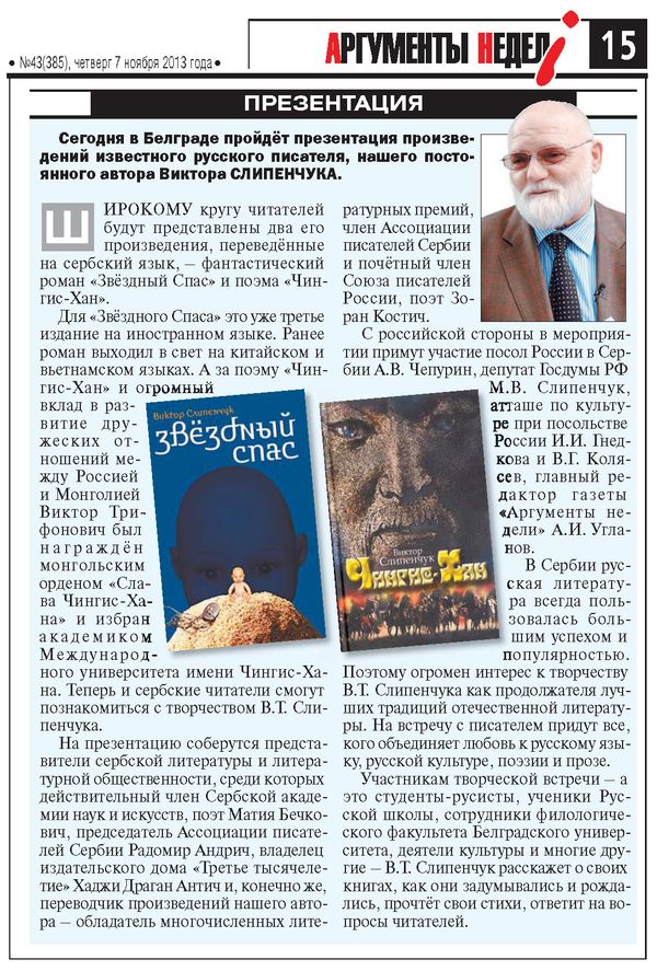 АРГУМЕНТЫ НЕДЕЛI, №43 (385), анонс предстоящей презентации книг В.Т. Слипенчука «Звёздный Спас» и «Чингис-Хан» в Сербии, 7 ноября 2013 года