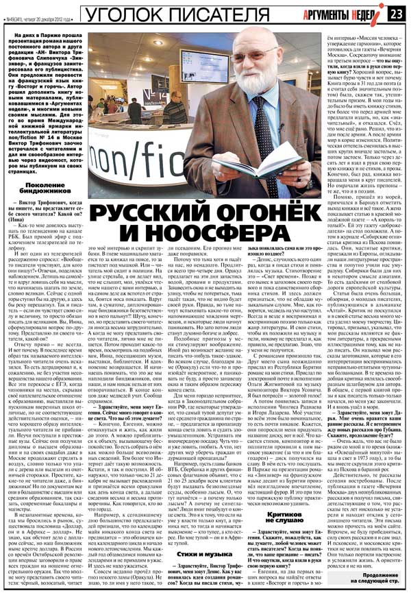АРГУМЕНТЫ НЕДЕЛI, № 49 (341), «Русский огонёк и ноосфера», ответы Виктора Слипенчука на вопросы читателей, посетивших 14-ю выставку интеллектуальной литературы non/fiction в Москве 1 декабря 2012 года, 20 декабря 2012 года