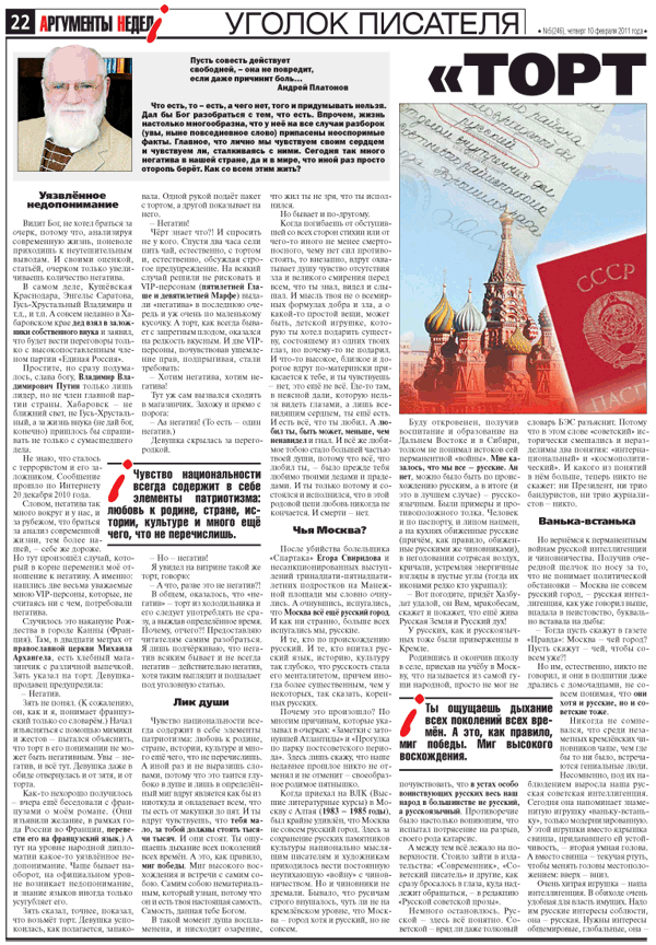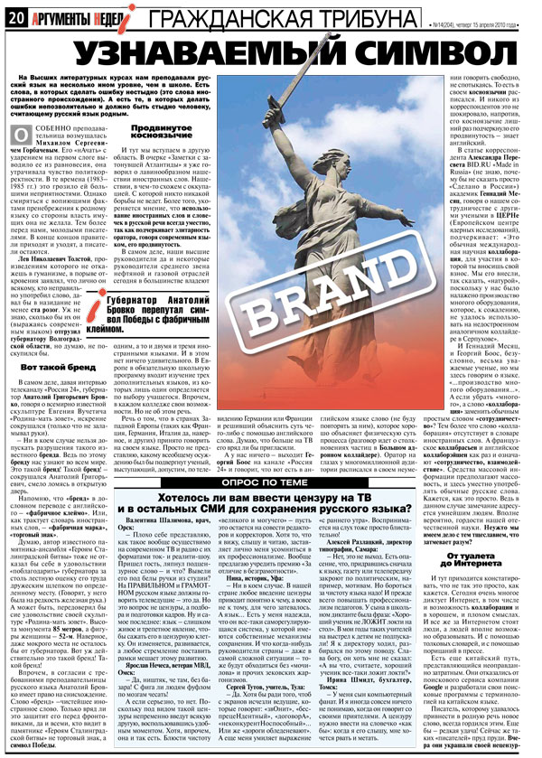 АРГУМЕНТЫ НЕДЕЛI, № 14 (204), статья «Узнаваемый символ и родная речь», 15 апреля 2010 года