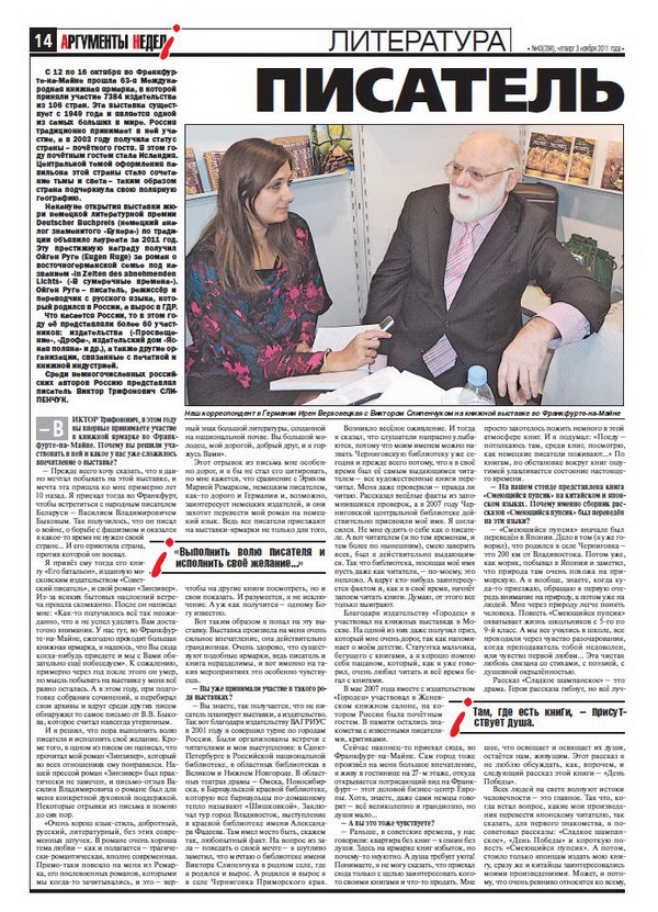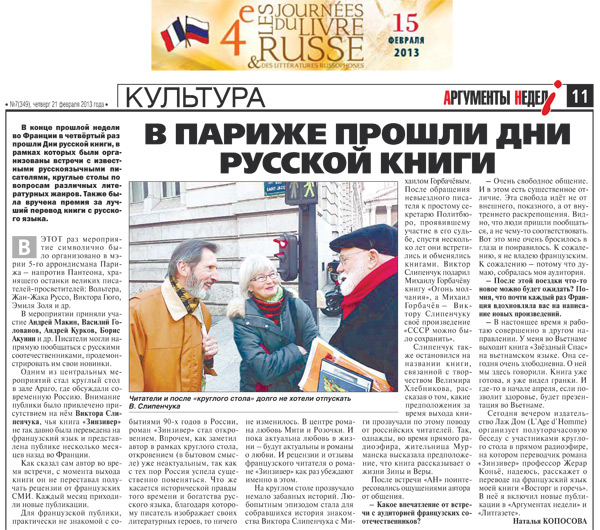 АРГУМЕНТЫ НЕДЕЛI, № 7 (349), «В Париже прошли дни русской книги», репортаж Н. Копосовой о «Днях русской книги» в Париже с участием Виктора Слипенчука, 21 февраля 2013 года