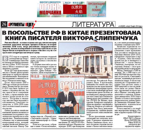 АРГУМЕНТЫ НЕДЕЛI, №10 (402), статья о презентации книги Виктора Слипенчука «Огонь молчания» в Китае 20.03.2014