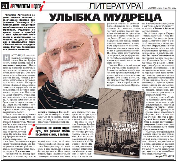 АРГУМЕНТЫ НЕДЕЛI, №17 (409), статья А.И. Угланова о книге В.Т. Слипенчука "Улыбка капитана", 15 мая 2014 года