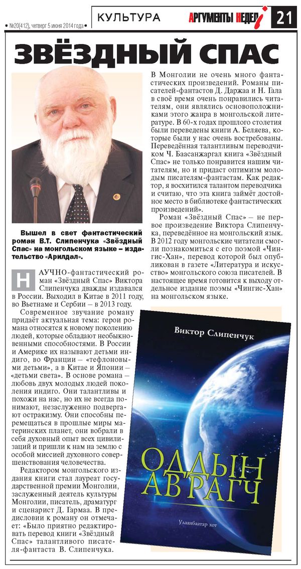 АРГУМЕНТЫ НЕДЕЛI, №20 (412), статья о выходе романа В.Т. Слипенчука «Звёздный Спас» на монгольском языке 05.06.2014