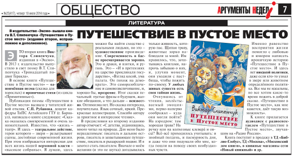 АРГУМЕНТЫ НЕДЕЛI, №25 (417), статья о выходе книги В.Т. Слипенчука «Путешествие в Пустое место» — издательство «Эксмо», 10 июля 2014 года