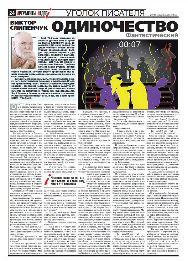 АРГУМЕНТЫ НЕДЕЛI, № 36 (328), рассказ «Одиночество и грёзы», 20 сентября 2012 года
