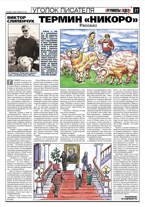 АРГУМЕНТЫ НЕДЕЛI, № 43 (335), рассказ «ТЕРМИН НИКОРО», 8 ноября 2012 года