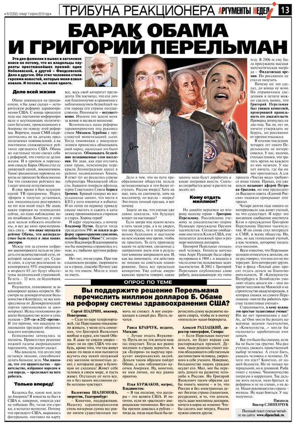 АРГУМЕНТЫ НЕДЕЛI, № 12 (202), статья «Барак Обама и Григорий Перельман», 1 апреля 2010 года