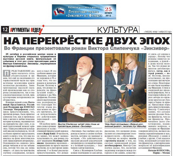 АРГУМЕНТЫ НЕДЕЛI, № 42 (334), «На перекрёстке двух эпох», репортаж Н. Копосовой о презентации романа «Зинзивер» в Париже, 1 ноября 2012 года