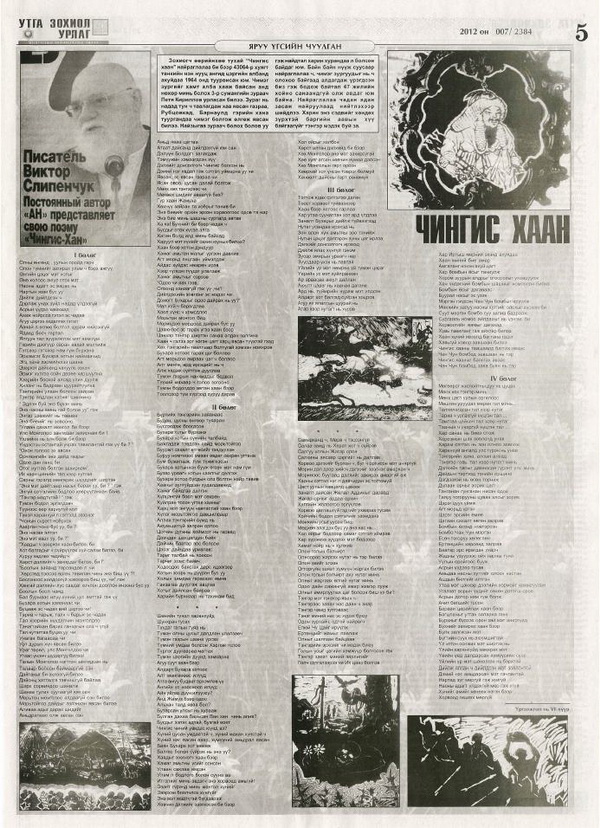 Газета «УТГА ЗОХИОЛ УРЛАГ» (г. Улан-Батор), №007/2384, поэма «ЧИНГИС-ХАН» на монгольском языке, 19 марта 2012 года