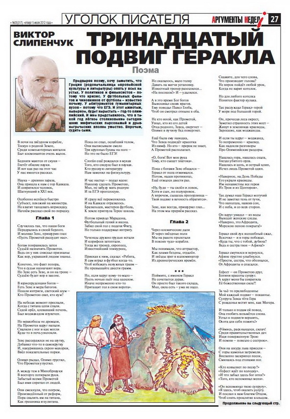 АРГУМЕНТЫ НЕДЕЛI, № 25 (317), поэма «Тринадцатый подвиг Геракла», 5 июля 2012 года