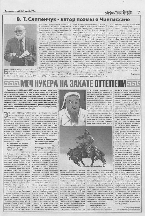 Газета «Угай зам» (г. Улан-Удэ, русскоязычное издание), №33, поэма «Чингис-Хан», май 2012 года