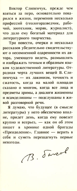Они, участники областного совещания молодых литераторов, собрались в актовом зале Приобского обкома комсомола на подведение итогов. Руководители семинара прозы склоняли Валерия Антоновича в превосходной степени - хвалили. Утверждали, что его повесть-дневник о рыбаках океанического лова - произведение зрелое и автора вполне можно рекомендовать в Союз писателей.