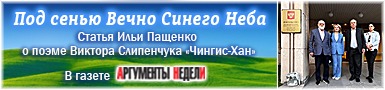 Читать здесь 25.06.2025В газете «Аргументы Недели» (№25(973), 25 июня - 1 июля 2025 г.) опубликована статья Ильи Пащенко «Под сенью Вечно Синего Неба» о поэме Виктора Слипенчука «Чингис-Хан».