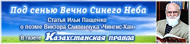 Читать здесь 16.06.2025В газете «Казахстанская правда» (13 июня 2025 г.) опубликована статья Ильи Пащенко «Под сенью Вечно Синего Неба» о поэме Виктора Слипенчука «Чингис-Хан».