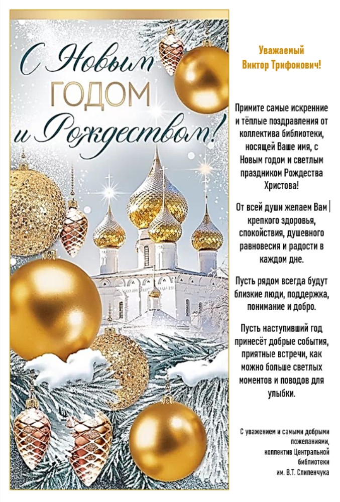 Смотреть здесь 12.01.2026В адрес В.Т. Слипенчука пришло поздравление от коллектива Центральной библиотеки села Черниговка.