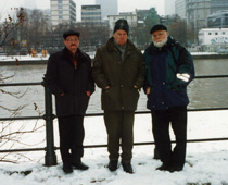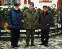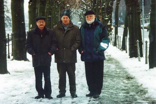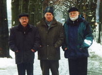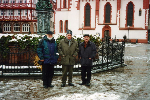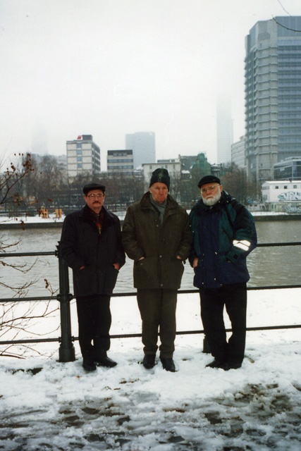 В платановой аллее. Алесь Кожедуб, Василь Быков и Виктор Слипенчук. Франкфурт-на-Майне, 2001 г. | |  Площадь Римлян. Виктор Слипенчук, Василь Быков и Алесь Кожедуб. Франкфурт-на-Майне, 2001 г. | |  Река Майн. Алесь Кожедуб, Василь Быков и Виктор Слипенчук. Франкфурт-на-Майне, 2001 г. |
