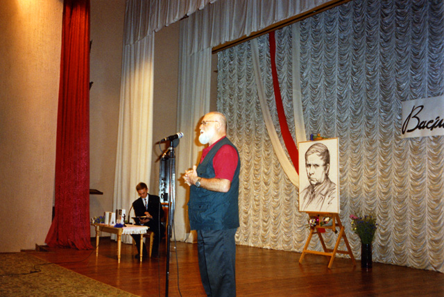 80-летие Василя Быкова. Выступление Виктора Слипенчука в Доме литераторов, Минск, 2004 г. | |  80-летие Василя Быкова. Римма Казакова, Дом литераторов, Минск, 2004 г. | |  Научная конференция, посвященная творчеству Василя Быкова. Филфак Белорусского Университета. Римма Казакова, Юрий Черниченко, Виктор Слипенчук. Минск, 2004 г. |