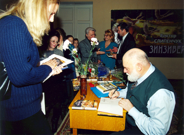 Презентация романа «Зинзивер» в областной библиотеке. Корреспондент Светлана Кукина и Виктор Слипенчук. Нижний Новгород. 2001 г. | |  Презентация романа «Зинзивер» в областной библиотеке. Корреспондент С.Кукина и директор фирмы «Полиграфсервис» В.Лазарев. Нижний Новгород. 2001 г. | |  Мемориальная доска, посвященная И.А.Бунину, А.Дерябкин и В.Слипенчук. Санкт-Петербург |