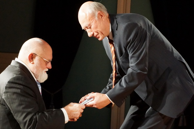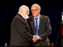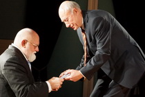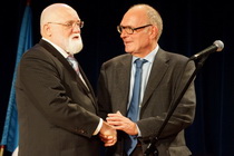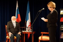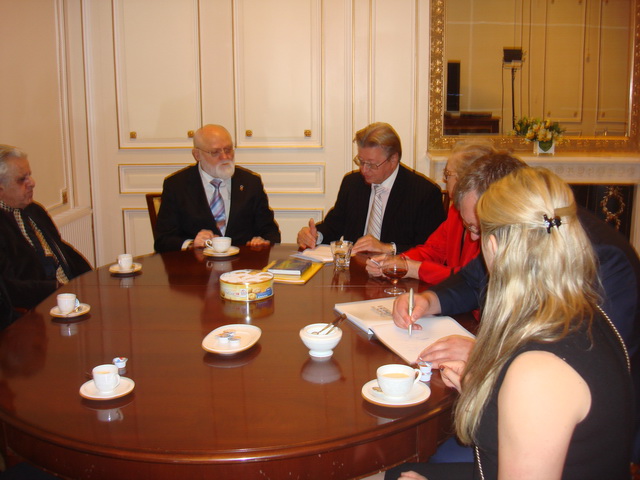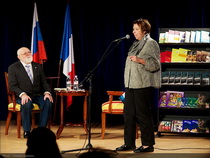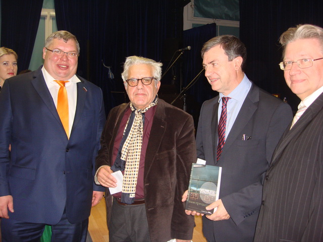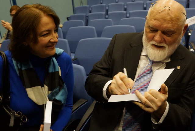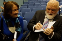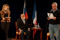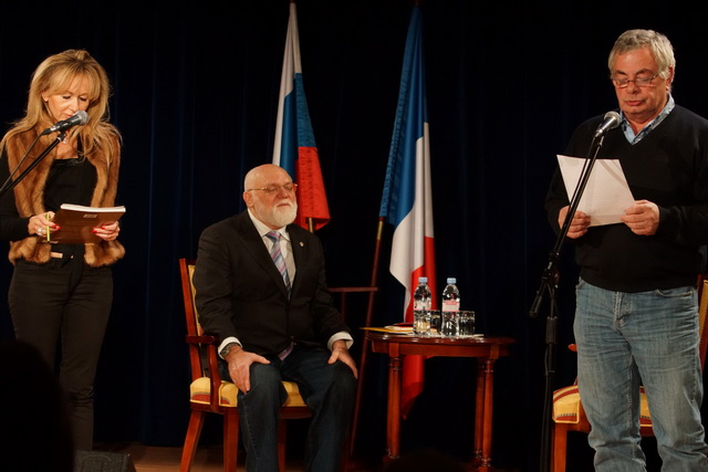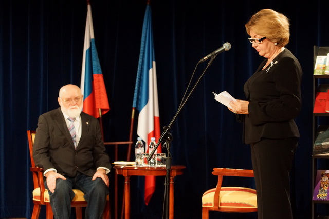 Член бюро ассоциации «Франко-российский диалог» Хуг Мальбер | |  В.Т. Слипенчук благодарит Х. Мальбера за высокую оценку романа | |  |