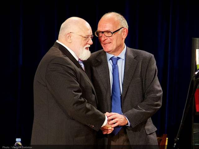 В.Т. Слипенчук и синхронный переводчик И.Г. Меркулова | |  | |  Виктор Слипенчук дарит Жерару Коньё альбом работ Павла Филонова |