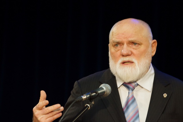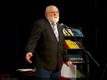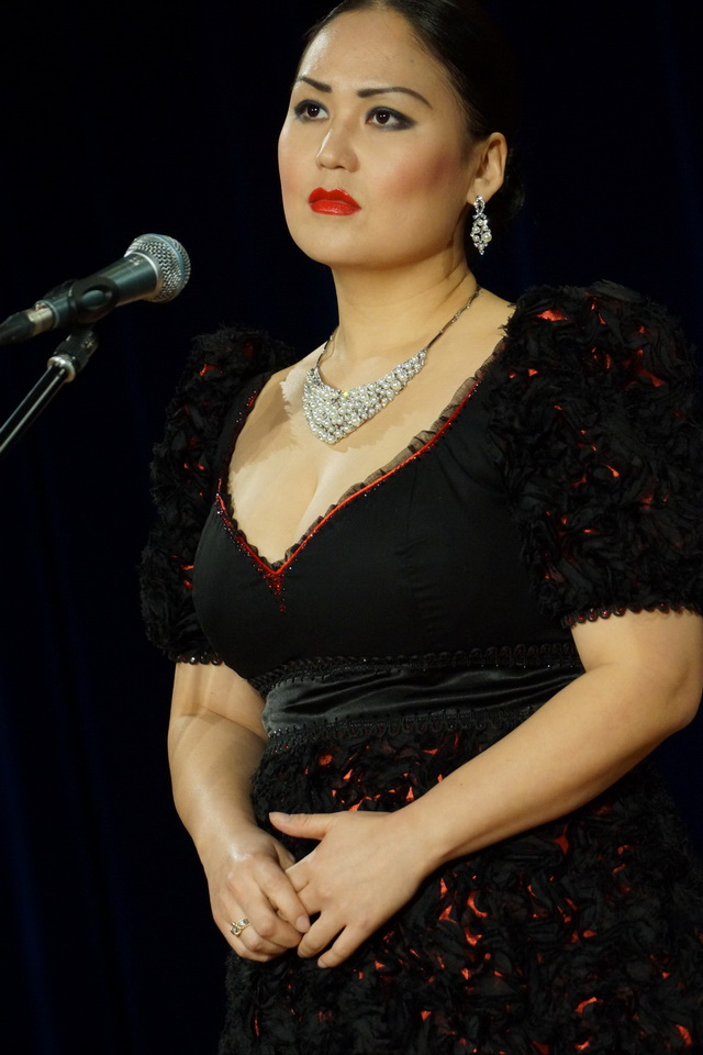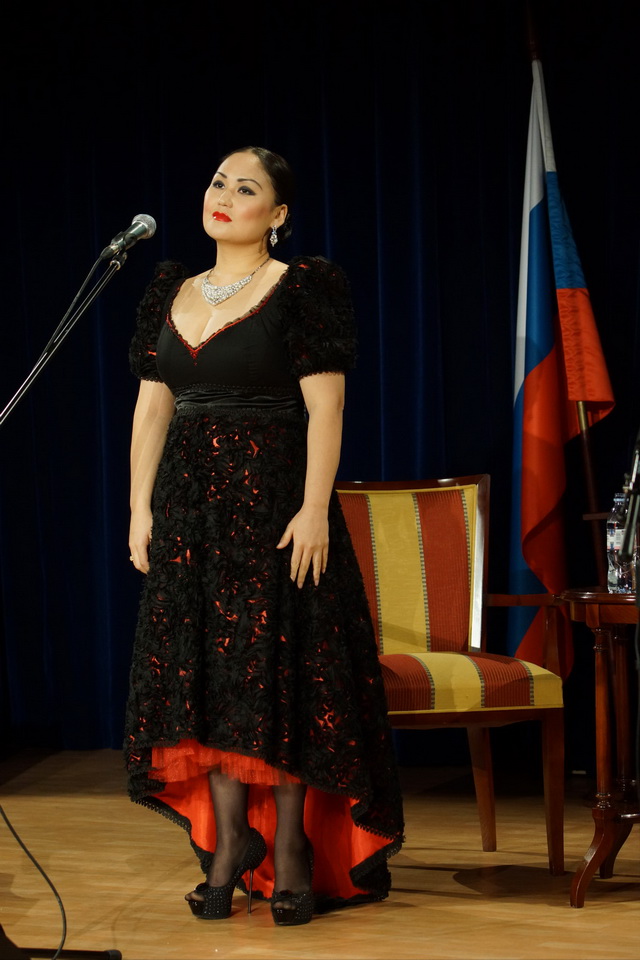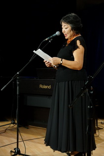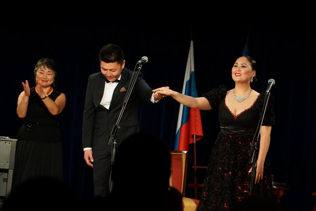 Концертмейстер Дарима Линховоин объявляет исполнителей романсов | |  Взял слово композитор Виктор Усович | |  |