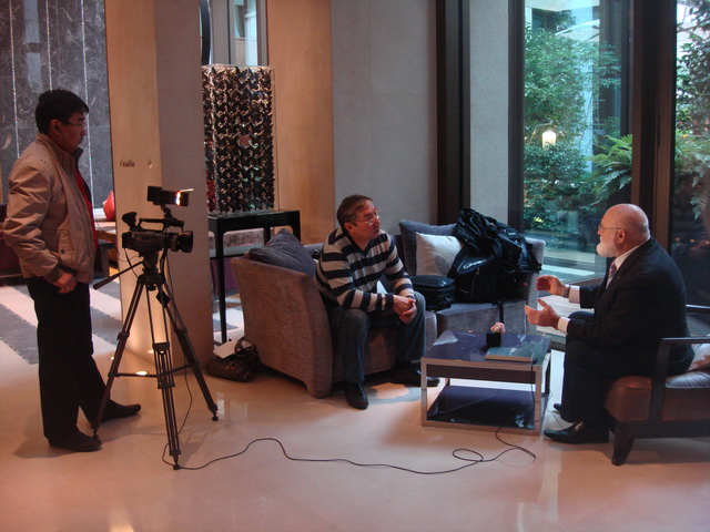 М.В. Слипенчук, Ж. Коньё, Ж.-П. Лекок и И.А. Шпынов | |  В.Т. Слипенчук дает интервью телеканалу «Сян-Цаг» | |  После презентации. Фото на память |
