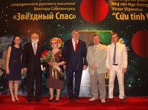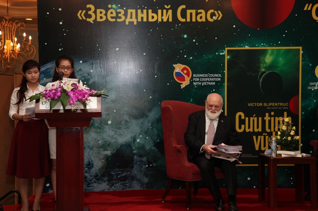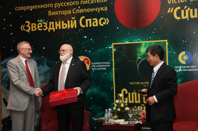 В фойе Hanoi Daewoo Hotel | |  А.Ю. Лавренёв, Буй Динь Зинь, М.В. Слипенчук, В.Т. Слипенчук, Г.М. Слипенчук | |  Хоанг Тхуи Тоан, Г.М. Слипенчук, В.Т. Слипенчук | | |  Актовый зал отеля перед началом презентации романа «Звёздный Спас» | |  | |  | | |  Зал полон | |  | |  | | |  Фунг Чонг Тоан, сотрудник РЦНК и ведущий вечера, открывает презентацию книги В.Т. Слипенчука «Звёздный Спас» | |  Алексей Юрьевич Лавренёв, директор РЦНК в Ханое, произносит приветственную речь | |  Буй Динь Зинь, Заместитель Председателя Общества Вьетнамо-Российской Дружбы, приветствует автора и собравшихся гостей | | |  Банг Вьет, поэт, переводчик, приветствует аудиторию и благодарит автора за книгу | |  Автор В.Т. Слипенчук приветствует гостей на вьетнамском языке | |  Вьетнамские студенты-русисты читают стихи Виктора Слипенчука | | |
