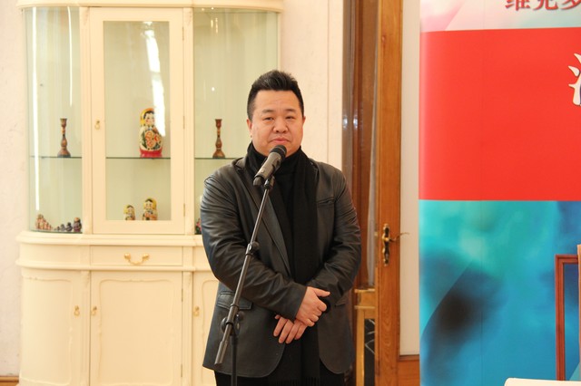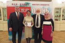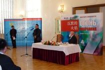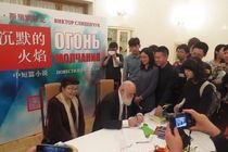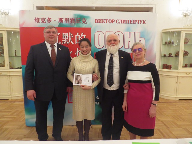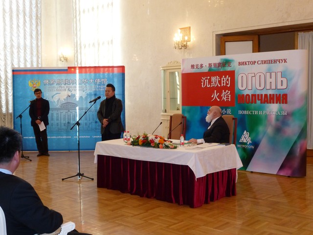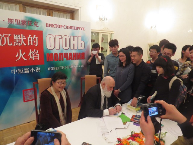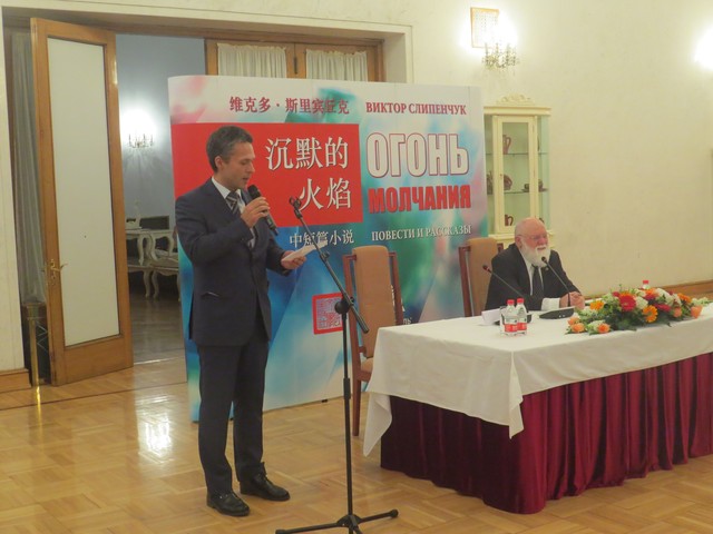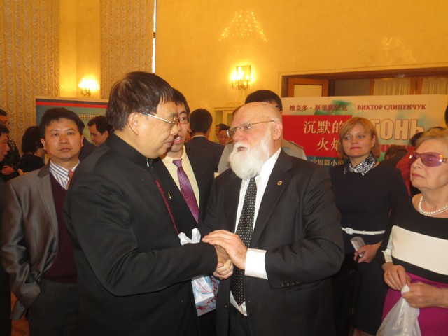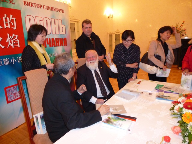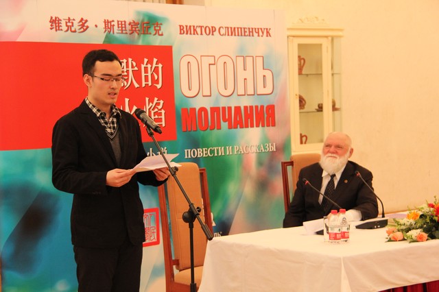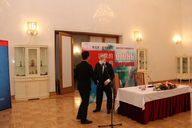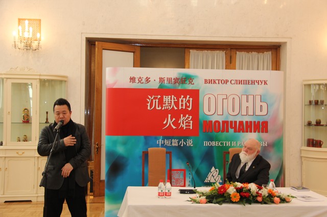 Член Союза писателей Китая Цю Хуадун благодарит организаторов встречи с писателем В.Т. Слипенчуком