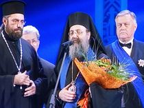 Председатель Попечительского Совета Центра национальной славы и Фонда Андрея Первозванного, Президент ОАО «Российские железные дороги» В. И. Якунин вручает премию Митрополиту Патрскому Хризостому (Греция)